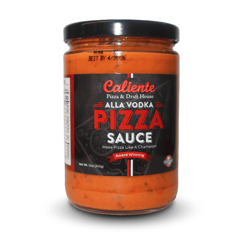 A jar of Caliente Alla Vodka Pizza Sauce, featuring a black lid and a red and black label with "Award Winning" and "Make Pizza Like A Champion" prominently displayed, perfect for recreating that authentic Pittsburgh Pizzeria experience.