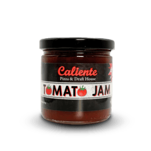 • A jar of Caliente Original Pizza Sauce with a black label, red text, and a black screw-on lid displayed on a white background, perfect for recreating that authentic Pittsburgh pizza experience at home.