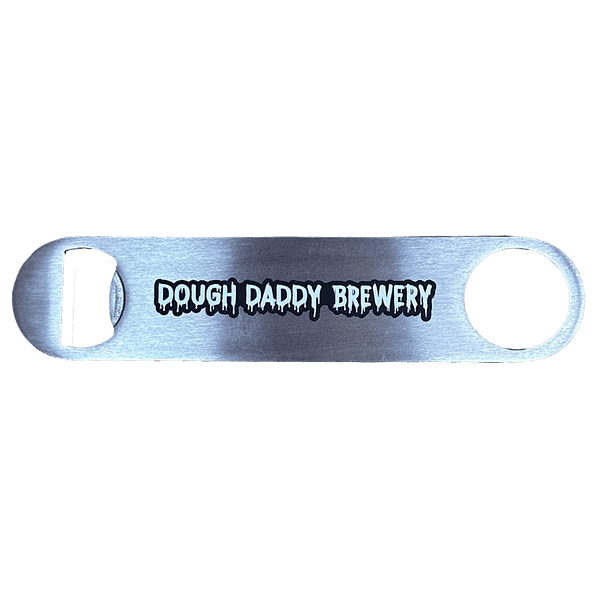 Silver metal bottle opener with "Dough Daddy Brewery" written in black, drippy letters across the center.