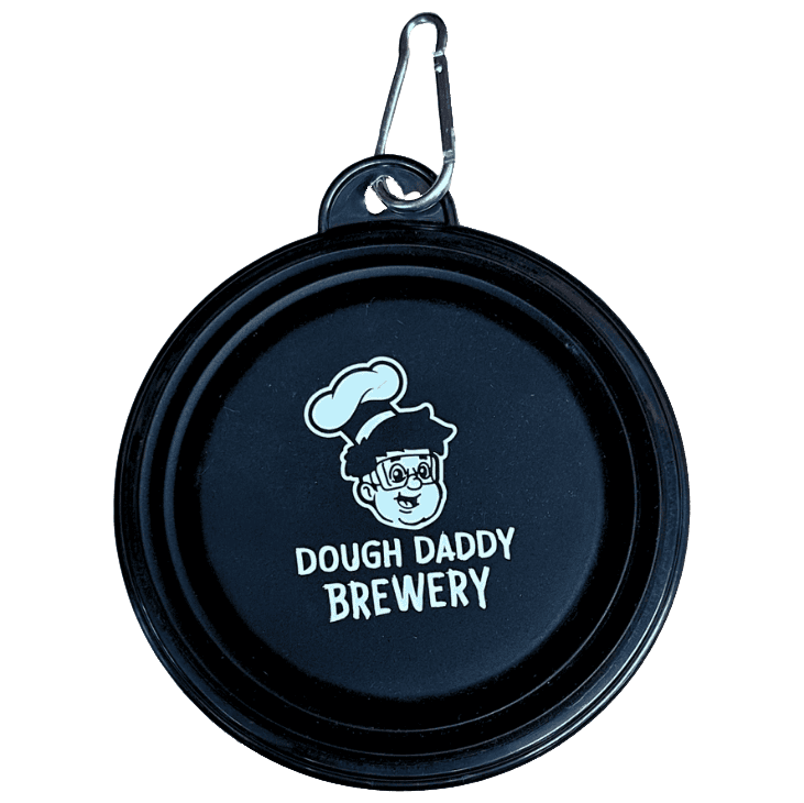 Black circular lid with "Dough Daddy Brewery" logo featuring a cartoon chef. Attached metal clip on top.