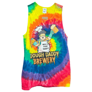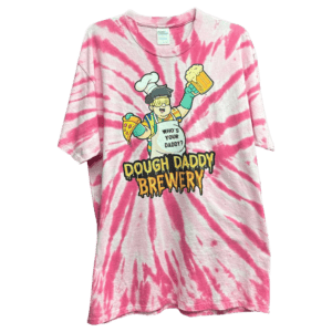 • A tie-dye T-shirt with pink, yellow, and blue swirls featuring a cartoon chef holding a pizza and beer, text reads "Dough Daddy Brewery".